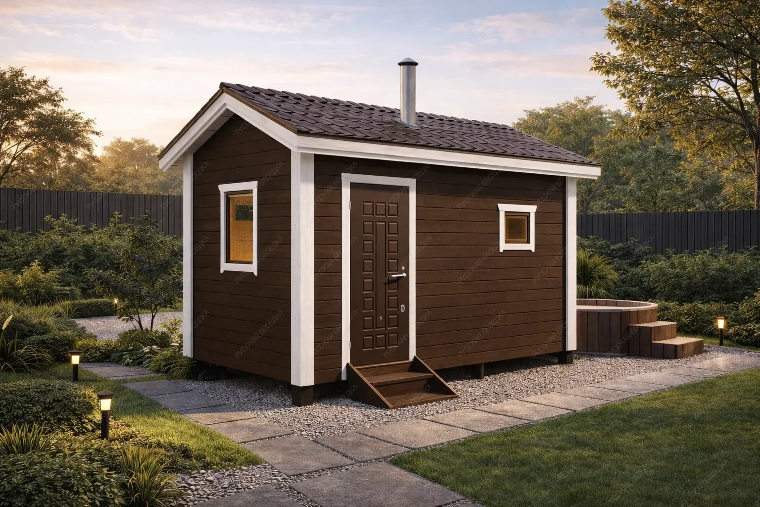 Мобильная баня «Мини» с двухскатной крышей представляет собой наиболее компактное решение в своем классе, занимающее всего 6,9 кв.м. площади при габаритах 3х2,3 метра. Её конструкция создана для ситуаций, где критически важна экономия пространства без ущерба для базового банного ритуала. Планировка включает два основных помещения: функциональную парную и небольшую раздевалку, выполняющую роль буферной зоны для сохранения тепла и комфорта. Стандартное остекление обеспечивает достаточное естественное освещение, сохраняя при этом классический внешний облик и эффективную теплоизоляцию. Двухскатная крыша придает строению устойчивый, завершенный вид и способствует быстрому отводу осадков. Ключевым преимуществом является абсолютная мобильность — объект может быть установлен на любом подготовленном участке за минимальное время, не требуя капитального фундамента или сложных подготовительных работ. Эта модель идеально подходит для небольших дачных участков, в качестве сезонного или дополнительного варианта, а также как быстро реализуемое решение для личного спа-уголка там, где другие форматы неприменимы.