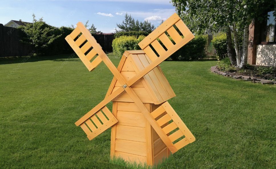 Для придания красоты участка можно использовать разные декоративные изделия, например, деревянные мельницы, которые могут использоваться как самостоятельный элемент украшения, так и быть частью продуманной композиции.
