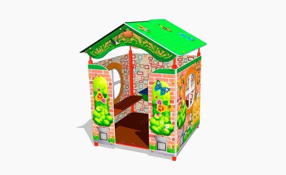 Детский игровой домик «Дача» представляет собой металлический каркас, облицованный фанерными накладками. Внутри домика расположены две скамейки и столик. Все рисунки как внешние, так и внутренние выполнены при помощи прямой УФ печати. Игровые домики используется для организации сюжетно-ролевых игр детей дошкольного возраста, развивает у них образное мышление любознательность и творческую инициативу.