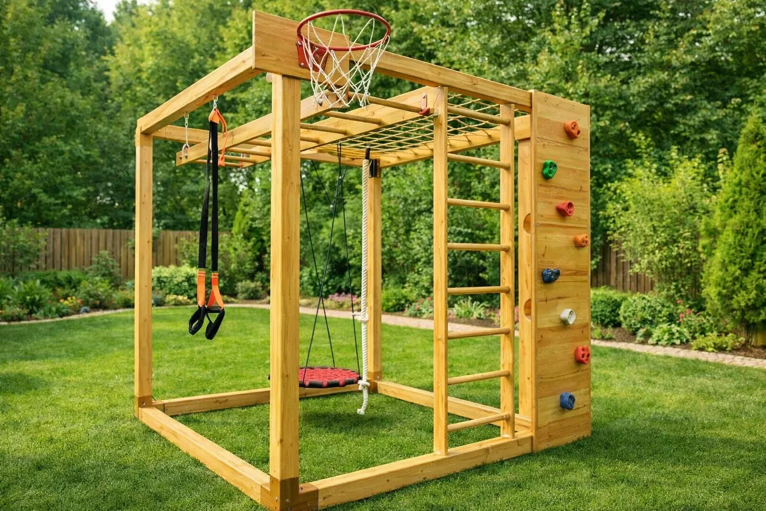 Деревянные детские спортивные комплексы — это пространство, где рождается сила, ловкость и уверенность в себе. Натуральное дерево, экологичное и тактильно тёплое, создаёт особую атмосферу уюта и безопасности, принципиально отличаясь от холодного металла. Это не просто снаряды, а настоящий островок приключений, который растёт и меняется вместе с ребёнком. Каждый комплекс представляет собой модульную систему, где базовую конструкцию дополняют разнообразные элементы. Гладкая горка для весёлого скольжения, мини-скалодром для развития координации, классические качели, рисующие в воздухе плавные дуги, и надёжный турник для формирования правильной осанки. Верёвочные лестницы и канаты учат балансу и работе с собственным весом, а баскетбольное кольцо оттачивает точность броска. Секция с лестницей может быть расположена под любым углом, создавая уникальную траекторию для лазания. Такая вариативность позволяет создавать сооружение под конкретные задачи и доступное пространство. Все комплектующие можно комбинировать и заменять, адаптируя игровую зону под взросление ребёнка и появление новых интересов. Конструкции отличаются безупречным качеством обработки: отшлифованная древесина, исключающая занозы, прочные соединения и устойчивость к нагрузкам. Это капитальное вложение в физическое развитие, где каждая деталь продумана для активных игр и безопасного штурма вершин.
