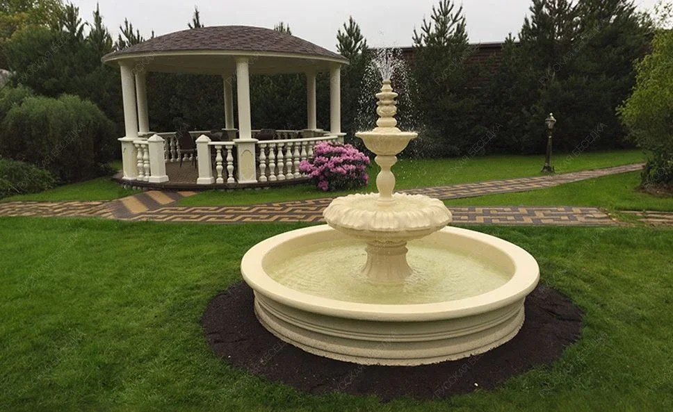 Классический фонтан для украшения дачи, коттеджа или загородного дома. Исполнение в данном цвете придает модели элегантность и сдержанность. Она хорошо будет смотреться как на фоне дорогого особняка, так и рядом с небольшим домом. Благодаря компактному бассейну этот фонтан можно разместить даже на небольшом участке. Бежевый фонтан с небольшим бассейном и элегантными сердечником, который состоит из каскада чаш, поможет создать уютный уголок рядом с домом. Благодаря небольшим размерам модель будет хорошо смотреться рядом с одноэтажным домом или на небольшом приусадебном участке. Бежевый фонтан подойдет для украшения летней площадки перед кафе, небольшого городского сквера и других общественных мест. Небольшой фонтан в бежевом цвете привлекает лаконичными, но изящными формами. Композиция выглядит целостной, изящной и уравновешенной, не перегруженной лишними деталями.