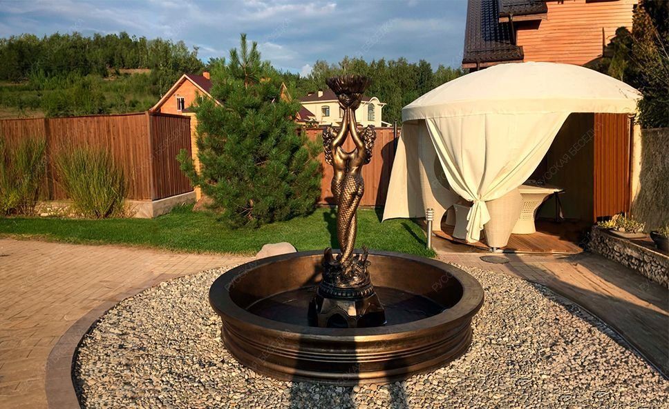 Садовый фонтан Русалки состоит из бассейна с цельным дном и бортами, подставки под насос и скульптуры двух русалок. Этот фонтан выполнен в оригинальном цвете – античная бронза. Данный цвет прекрасно сочетается с тёмно-шоколадным фасадом здания.               Садовый фонтан из бетона с Русалками станет отличным украшением вашего участка. Этот фонтан оптимален для участков среднего и большого размера. Эффектная скульптурная композиция с двумя русалками напоминает нам сюжеты старых добрых русских сказок. Этот персонаж славянской мифологии ассоциируется со стихией воды, с духами водоёмов. Длинноволосые девушки считались защитницами лесов, полей и вод. Данный садовый фонтан из бетона состоит из 4-х разборных элементов: цельная чаша диаметром 235 см, подставка под русалку, скульптура русалок и ракушка в руках у русалок.  Одно из главных преимуществ этого фонтана заключается в том, что бассейн не требует никаких работ по сборке и установке. Цельная чаша стразу устанавливается на площадку, её не нужно склеивать, гидроизолировать и выравнивать. Это значительно упрощает и процедуру доставки. Фонтан выполнен из высококачественного архитектурного бетона с добавлением полимеров и морозоустойчивых добавок. Технология трёхслойной покраски с использованием высококачественного грунта закладывает основу для длительного использования фонтана. Мы делаем архитектурный бетон только из лучших материалов от ведущих производителей. Технология изготовления и соблюдение всех технологических норм позволяет нашим клиентам использовать наши изделия в течение длительного срока. Фасадная краска, которая получила одобрение наших специалистов после долгого и упорного поиска и тестов, держится значительно дольше любых аналогов, при этом визуально она также смотрится выигрышно.