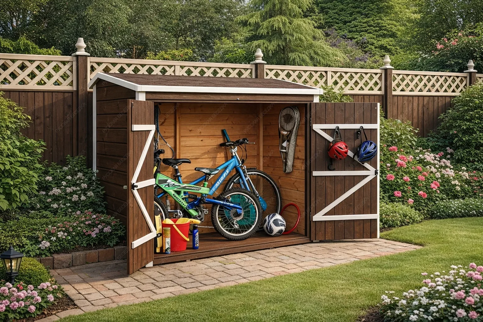 Деревянный гараж для велосипедов — это продуманное решение для хранения двухколёсной техники и сопутствующего инвентаря. Компактное строение из натурального дерева защищает велосипеды от дождя, снега, ультрафиолета и перепадов температур, продлевая срок службы узлов и сохраняя внешний вид рам. Внутреннее пространство организовано с учётом потребностей активных людей: предусмотрены удобные полки для шлемов, насосов, инструментов и смазочных материалов, а также крючки для подвешивания покрышек, велокомпьютеров или рюкзаков. Такая система хранения позволяет быстро найти нужную вещь и поддерживать порядок без лишних усилий. Изготовленный из качественной древесины, гараж гармонично вписывается в ландшафт загородного участка или городского двора, не нарушая эстетики окружающей среды. Дерево обеспечивает естественную вентиляцию, предотвращая образование конденсата, который вреден для металлических деталей. Конструкция рассчитана на длительную эксплуатацию и может быть выполнена в различных размерах, чтобы вместить от одного до нескольких велосипедов. Надёжные крепления и устойчивость к ветровым нагрузкам гарантируют сохранность имущества даже в сложных погодных условиях. Аккуратное размещение велосипедов освобождает полезную площадь гаража, сарая или балкона, делая повседневную жизнь более комфортной и организованной.