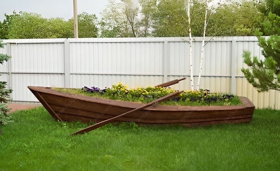 Декоративная лодка-цветочница из дерева прекрасно дополнит участок и оживит его красоту. Изделие смотрится очень органично в саду, и в внешне очень напоминает настоящую деревянную лодку. Единственное отличие – ее нельзя погружать в воду, но при этом можно и нужно усеивать цветами. У лодки нет дна, что необходимо для обеспечения правильного оттока воды при посадке внутрь живых растений. Лодка обработана антисептиками и окрашена в желаемый цвет, при этом в стоимость деревянной лодки уже включена и пропитка и покраска.