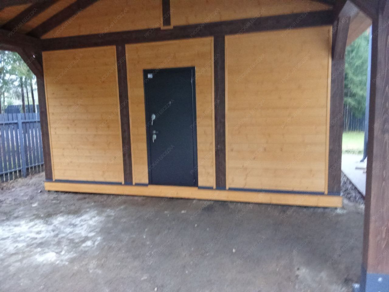 Для производства всех элементов навеса используется только отборная древесина без малейших дефектов, прошедшая камерную сушку и пропитку антисептиками. Навесу после защитной обработки лаком не страшны высокая влажность, а значит, можно быть уверенным, что дерево не растрескается, не разбухнет и не покоробится.
