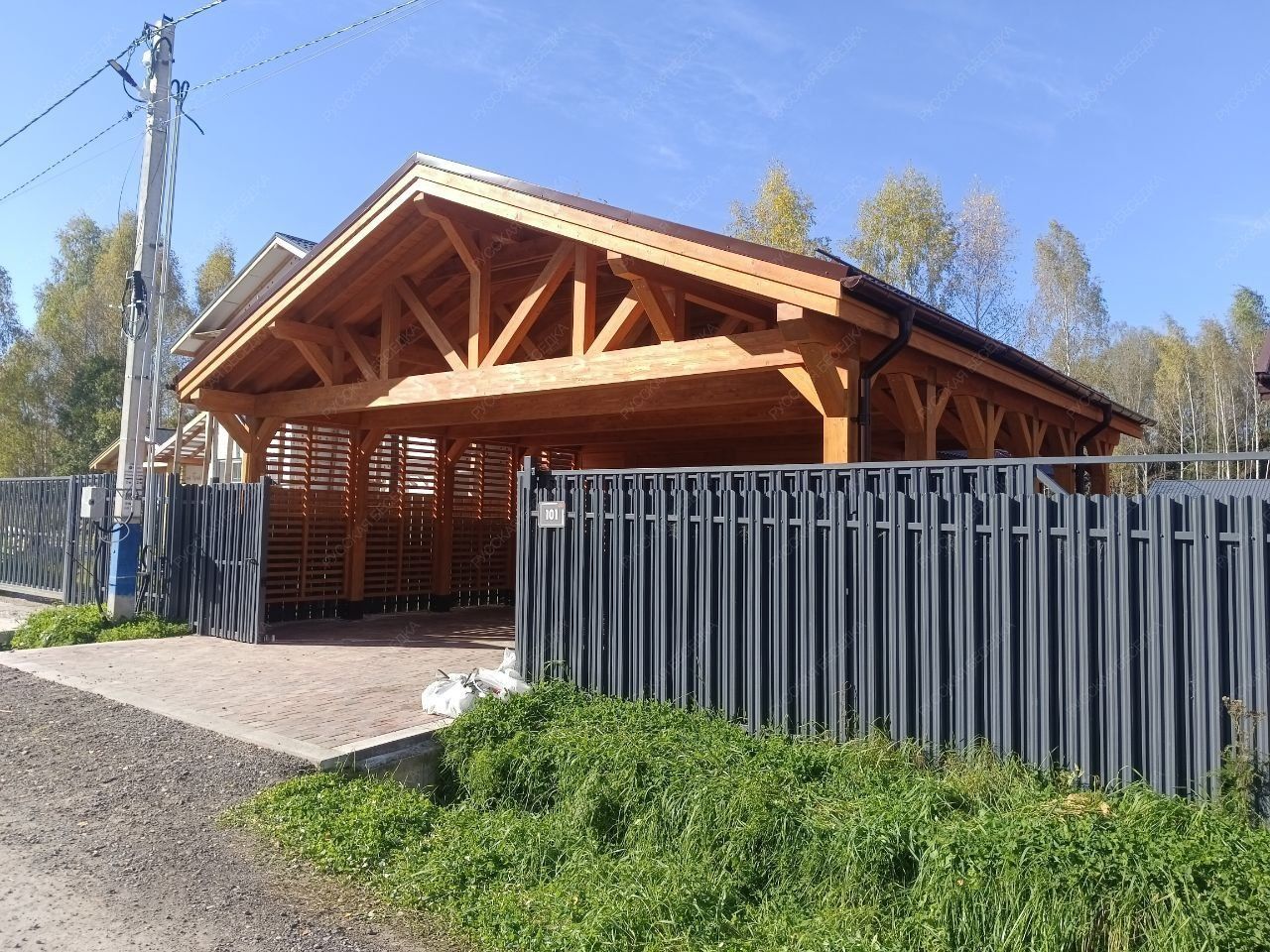 Навес из дерева послужит отличным парковочным местом для одного или нескольких автомобилей.