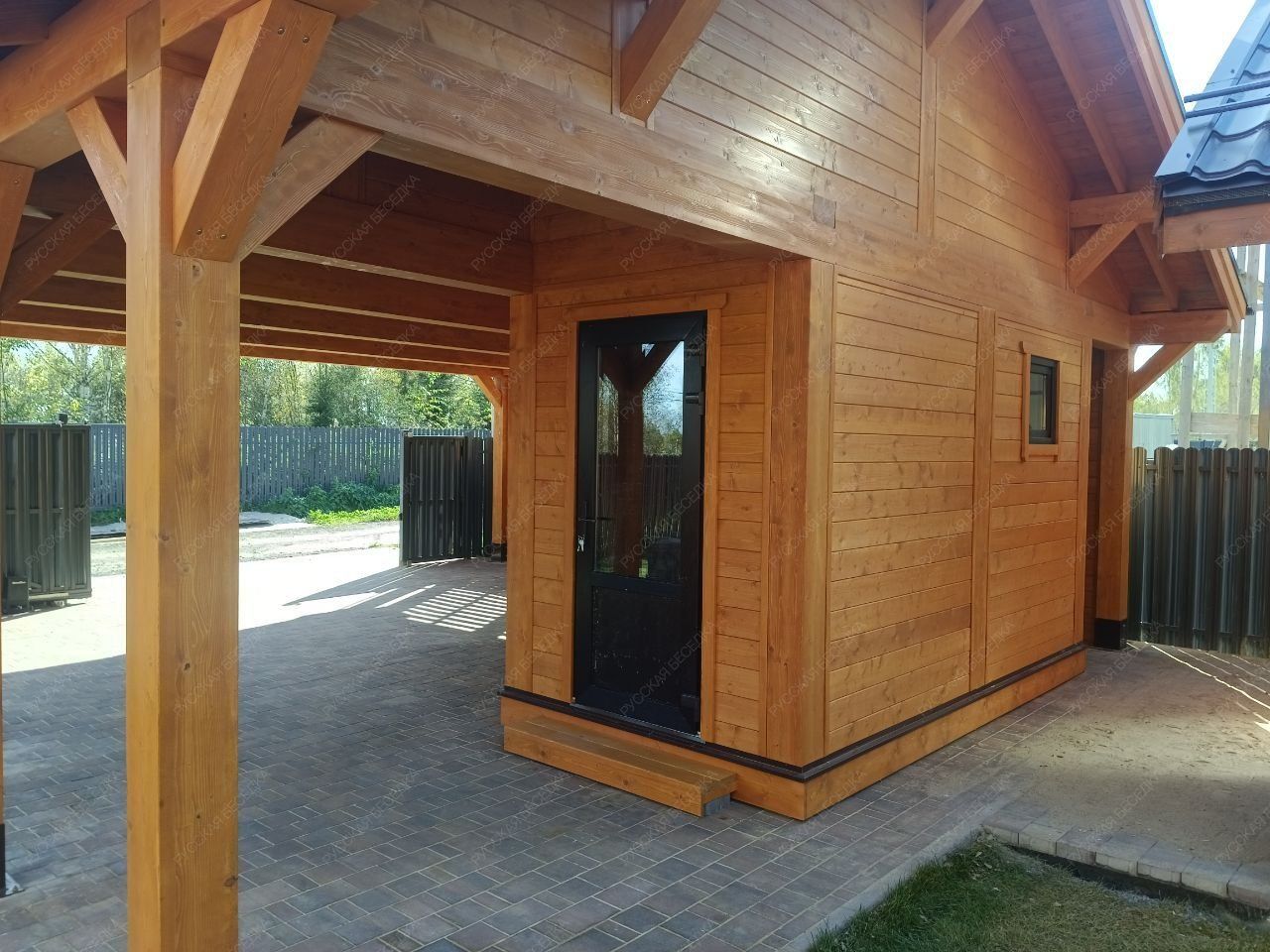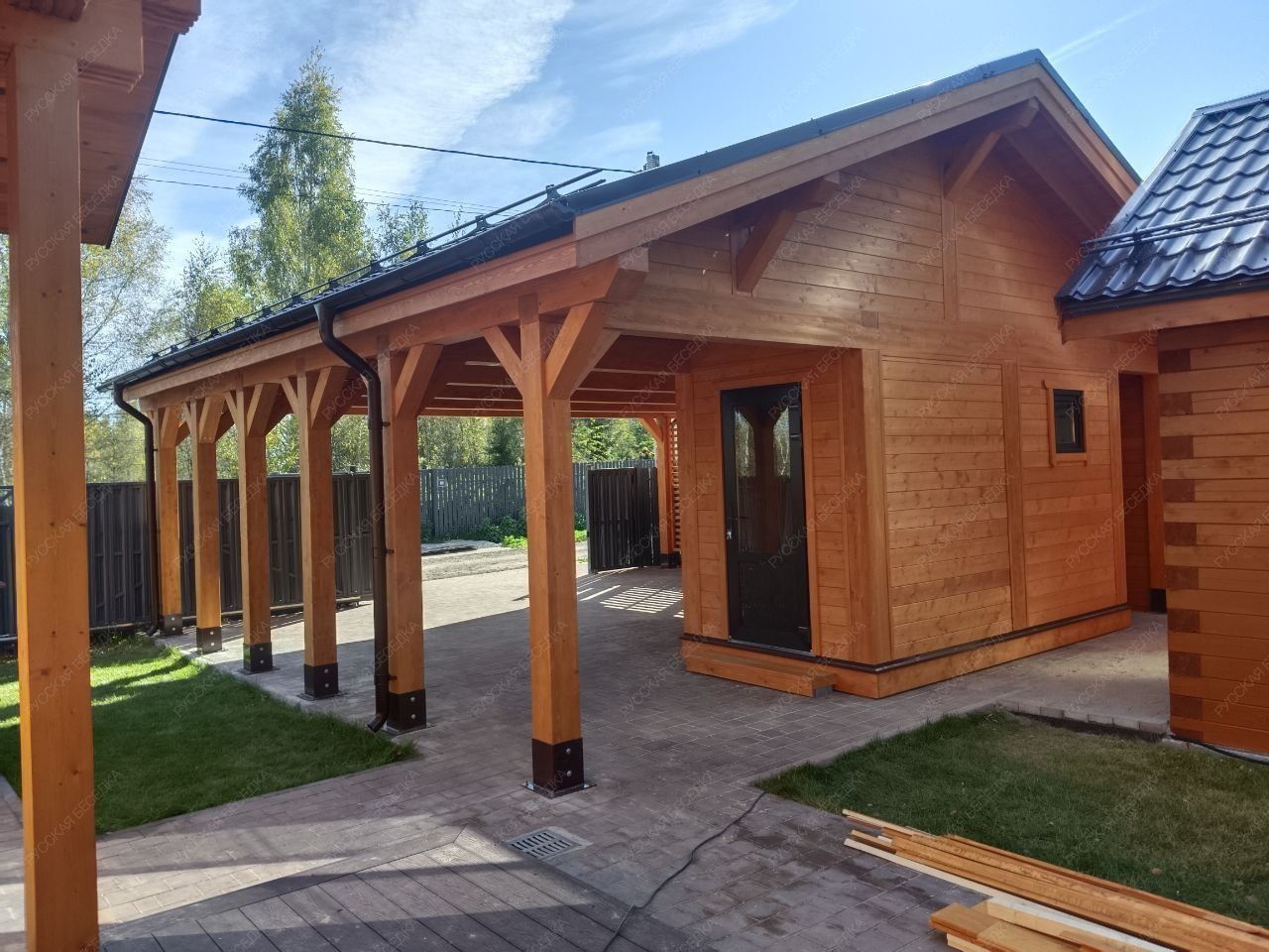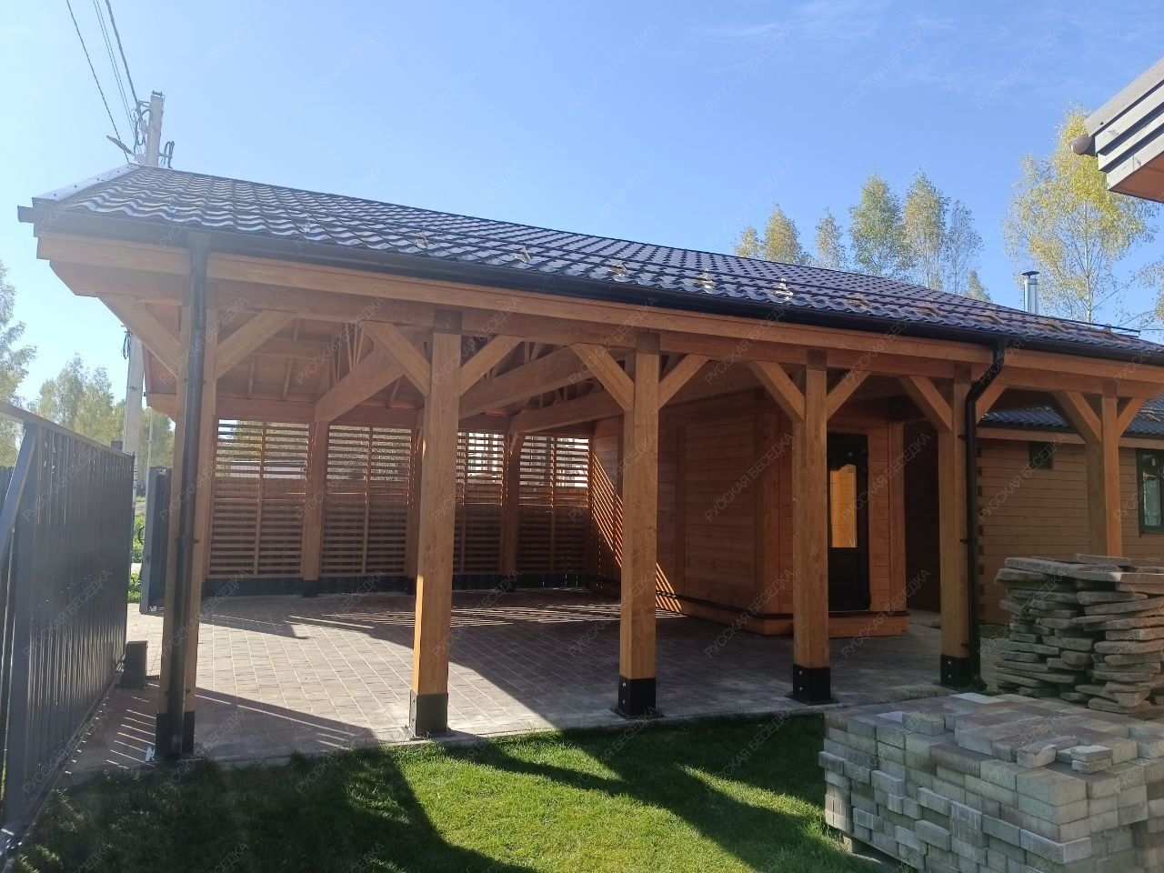 Для производства всех элементов навеса используется только отборная древесина без малейших дефектов, прошедшая камерную сушку и пропитку антисептиками. Навесу после защитной обработки лаком не страшны высокая влажность, а значит, можно быть уверенным, что дерево не растрескается, не разбухнет и не покоробится.