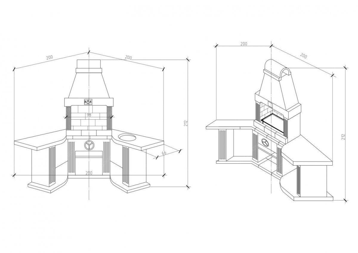 Конструкция печи разработана специально для установки в углу: беседки, летней кухни, между двумя частями забора. За счет того, что топка как бы уходит вглубь, а столешницы вынесены вперед, получается очень удобное, полузакрытое пространство для приготовления еды.
