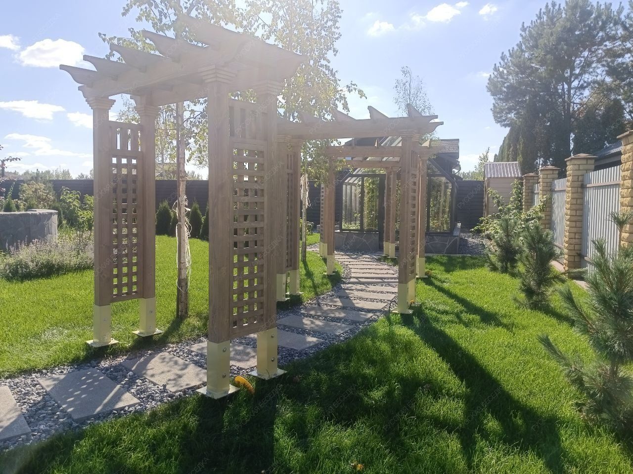 Пергола с навесом обеспечивает надежную защиту от солнечных лучей, создавая тенистое пространство для отдыха. Она станет идеальным местом для встреч с друзьями, чтения книг или приема пищи на свежем воздухе.