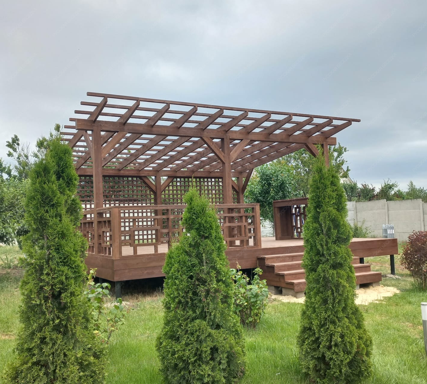 Деревянная пергола придаст вашему садовому участку теплую и уютную атмосферу.Также пергола может служить опорой для плетущихся растений - только представьте, как приятно находиться в окружении цветущего клематиса или пышных роз! Дополнительные элементы, такие как встроенное освещение, декоративные решетки, качели или скамейки, могут усилить визуальный эффект и создать еще более комфортное пространство. А если в конструкцию перголы добавить подиум, то он может служить местом для расслабления или стать сценой для семейных мероприятий.