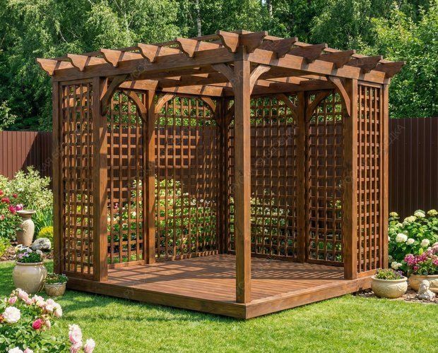 Перголы из дерева сочетают в себе природную красоту и современные дизайнерские решения, создают идеальное место для отдыха и различных видов досуга на открытом воздухе. Перголы могут стоять отдельно или быть частью композиции с другими элементами сада. Деревянная пергола придаст вашему садовому участку теплую и уютную атмосферу.Также пергола может служить опорой для плетущихся растений - только представьте, как приятно находиться в окружении цветущего клематиса или пышных роз! Дополнительные элементы, такие как встроенное освещение, декоративные решетки, качели или скамейки, могут усилить визуальный эффект и создать еще более комфортное пространство. А если в конструкцию перголы добавить подиум, то он может служить местом для расслабления или стать сценой для семейных мероприятий. Пергола с навесом обеспечивает надежную защиту от солнечных лучей, создавая тенистое пространство для отдыха. Она станет идеальным местом для встреч с друзьями, чтения книг или приема пищи на свежем воздухе. Любая пергола не только украшает ваш сад, но и предоставляет функциональное пространство для приятного времяпровождения на природе с семьей и друзьями.