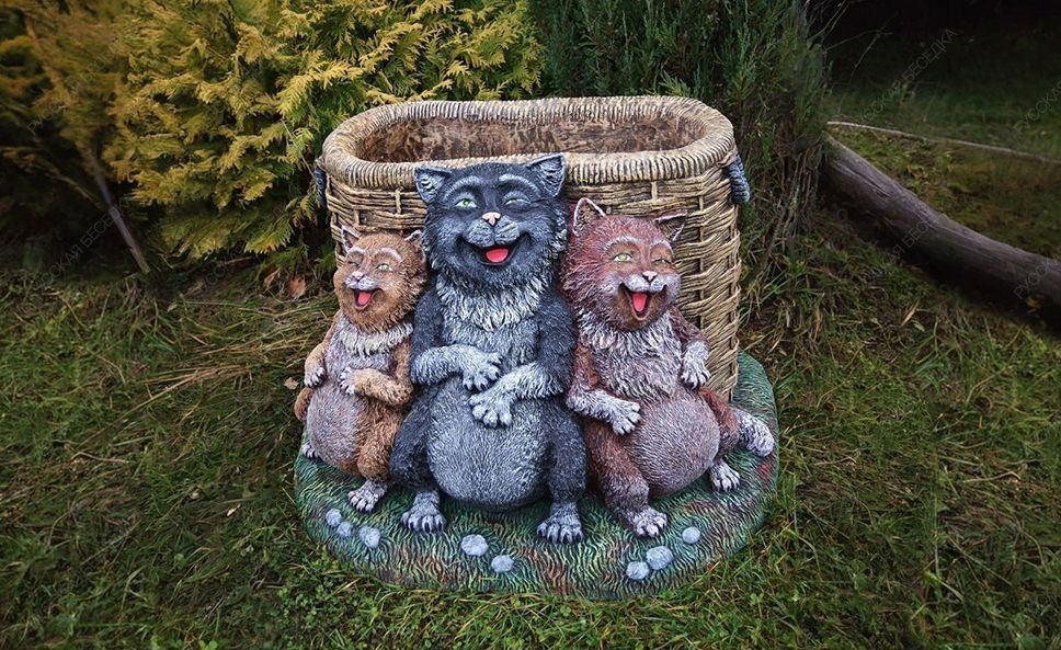 Садовая фигура (цветник) «Коты» украсит поляну или дополнит цветник, впишется в ландшафт, обогатит красотой природы Ваш участок. Фигурка изготовлена из прочного, лёгкого стеклопластика, противоударная и влагостойкая, не боится изменения температуры, сохранит на долгие годы первозданный вид.                       Скульптура кашпо для сада изготовлена из полиэфирной смолы и только отделана под корзину с фигурами котов. Благодаря такому исполнению скульптура может жить практически неограниченно длительное время, не требуя серьёзного ухода и это то, что нужно для садового декора.                                                           Вес: 12 кг Габариты (ВxШxГ): 55/80/60 см