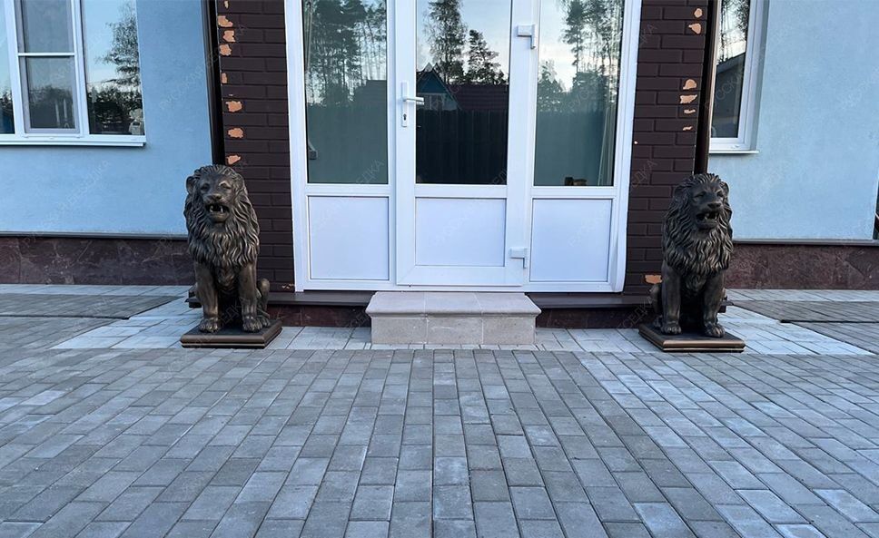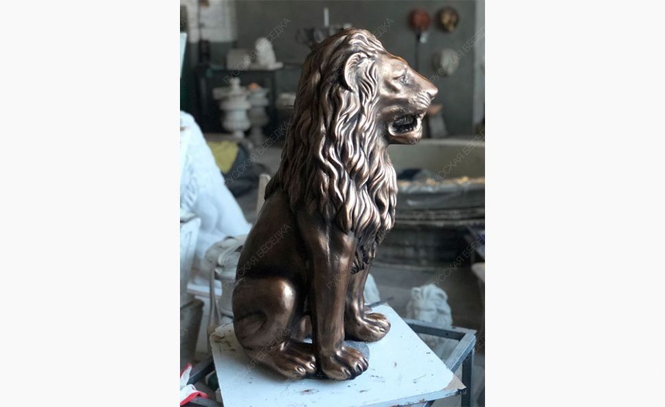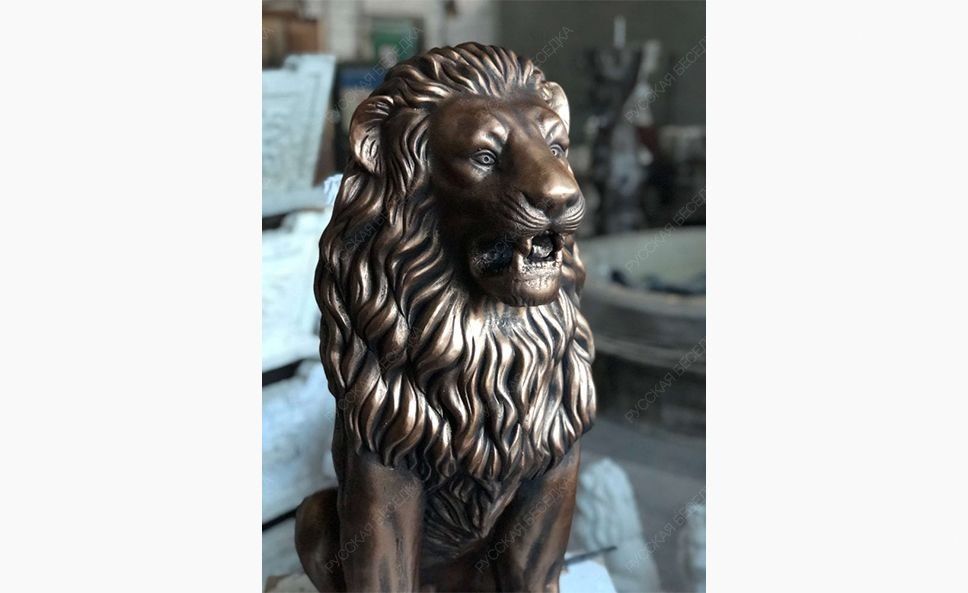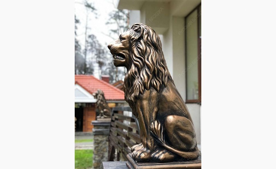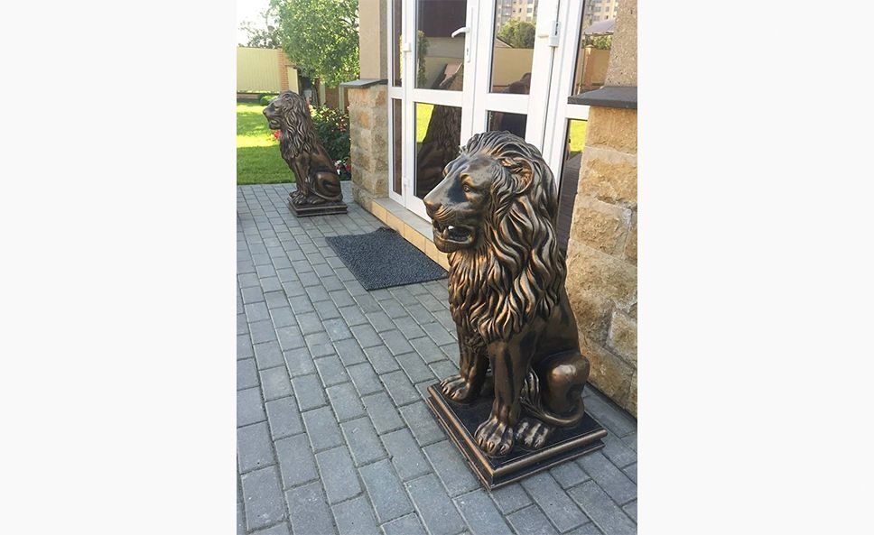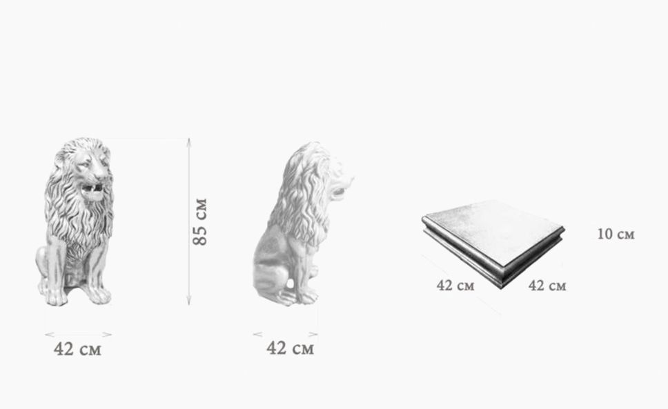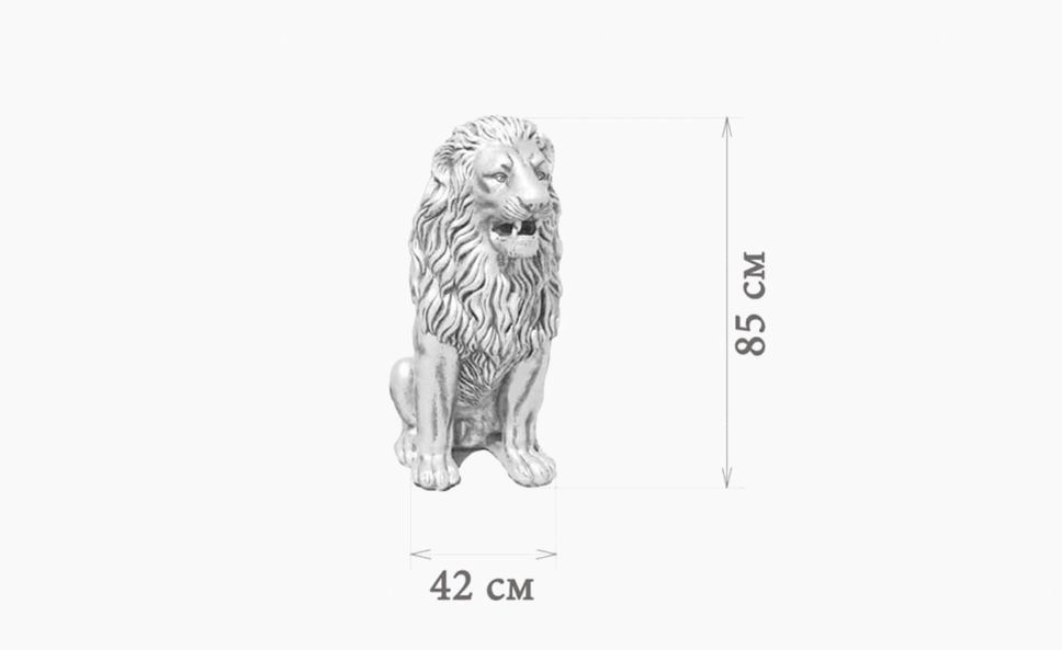 Классическая скульптура сидячего льва станет превосходным украшением парадного входа вашего жилья. Открытая пасть хищника, роскошная грива и впечатляющая мускулатура делает эту статую, пожалуй, лучшим предложением на рынке РФ. Чаще всего эти скульптуры используют для украшения парадного входа в дом и устанавливают на парапеты лестницы парой. При необходимости скульптуры можно закрепить клеем или анкерами. В нашем каталоге есть подставка, которую дополнительно можно приобрести для этой статуи.                                                  Статуи сидящих львов станут главным украшением вашего парадного въезда или входа в здание. Безупречная пластика хищного животного, искусно проработанная морда и грива, проступающий рельеф мускулатуры, – все это отличает наших львов от большинства скульптур, предлагаемых на российском рынке. Классический вариант использования сидящих львов – украшение входной группы. Животных, обычно в парном исполнении, устанавливают при въезде на частную территорию, водружают на парапет у входа в дом, украшают ими вход с улицы в кафе, рестораны, общественные учреждения. Не менее успешно львы зарекомендовали себя в качестве садово-парковых скульптур, элементов убранства просторных интерьеров и офисных помещений. Варианты использования королевских львов не ограничиваются ничем, кроме фантазии заказчика. При относительно небольшой высоте в 85 см масса скульптуры довольно внушительна – 130 кг. Смещенный к низу центр тяжести позволяет львам очень устойчиво размещаться на ровной поверхности, что исключает необходимость вспомогательного крепежа. Для дополнительной устойчивости и эстетичности оформления мы предлагаем специальную подставку 42 х 42 х 7 см. Декоративный подиум с аккуратным кантиком можно крепить к поверхности на плиточный клей, фиксировать анкерными болтами или просто установить на ровную поверхность. Если вы хотите обезопасить скульптуру от посягательств вандалов, её также желательно приклеить к подставке связующим раствором. Рекомендуем устанавливать и выравнивать статую на подставке максимально аккуратно, чтобы не повредить декоративное покрытие подиума.