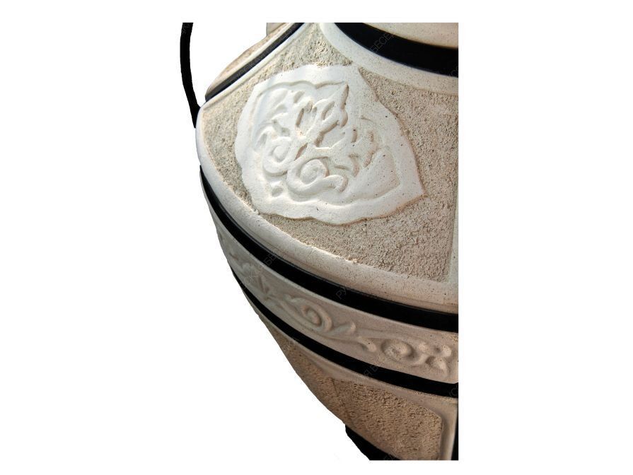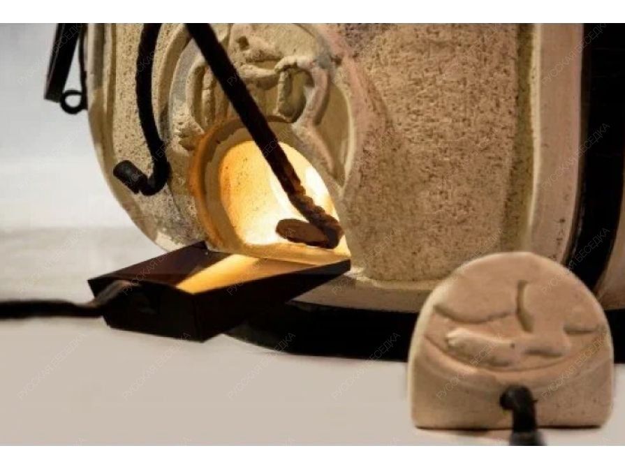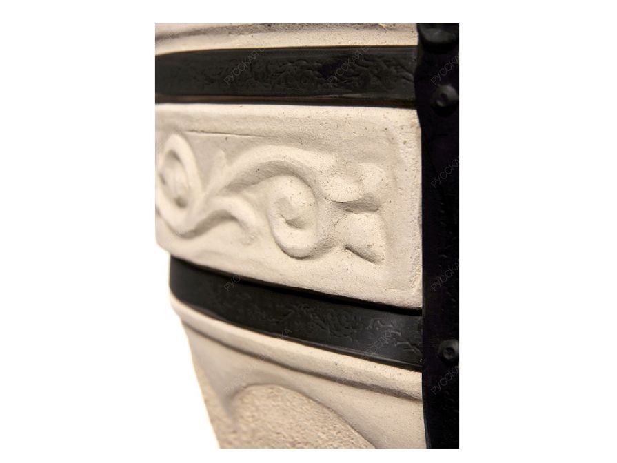 Форма напоминает амфору. Заключено изделие в кованый ажурный каркас. К печи прилагается подставка под стать изделию, и стойка для шампуров также выкованная вручную.