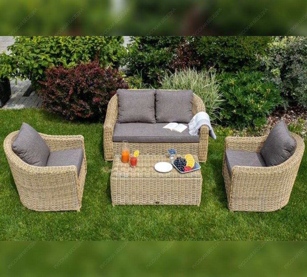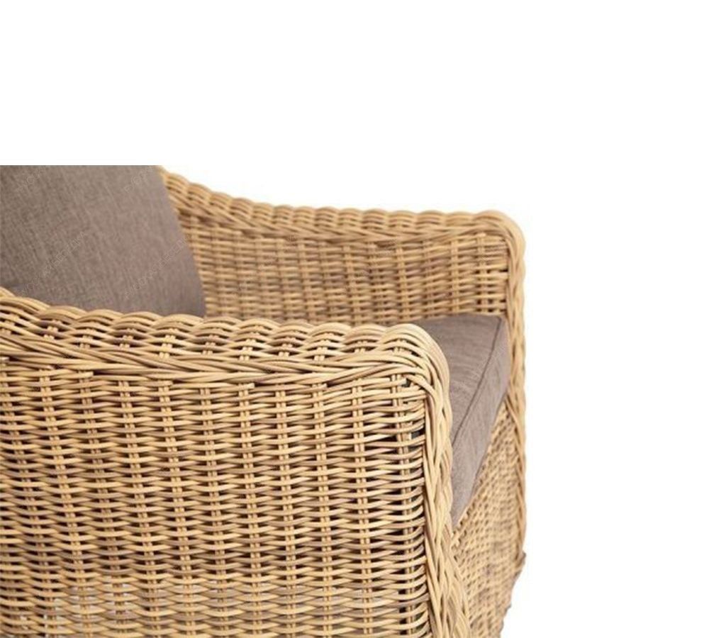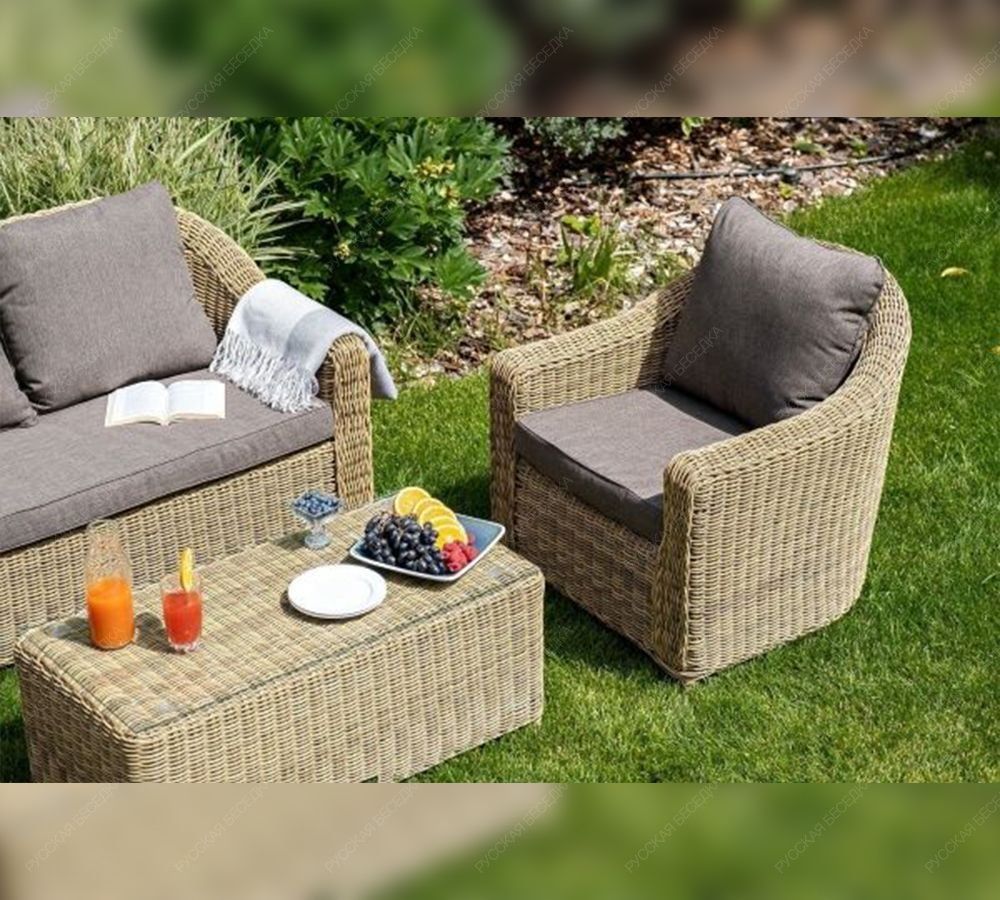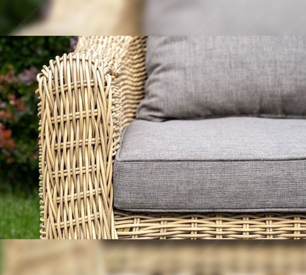 В основе мебели - алюминиевый каркас и круглый искусственный ротанг. Каркас оплетен с помощью ручного метода и представлен в соломенном цвете.